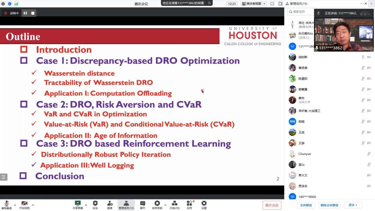 2022年8月8日9:00,第四期信通与控制前沿技术系列讲座通过腾讯平台顺利召开。休斯敦大学Zhu Han教授受邀与EMC易倍师生开展题为“Distributionally Robust Optimization and Machine Learning for Communication Networks”线上学术交流活动。交流会由胡封晔教授主持。
