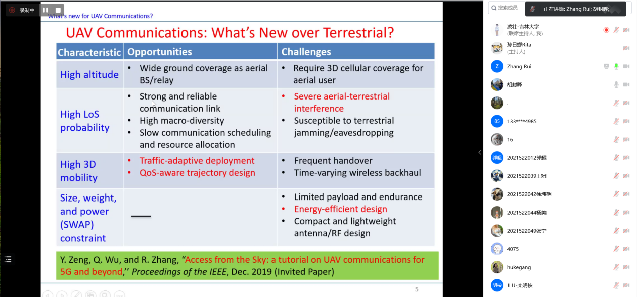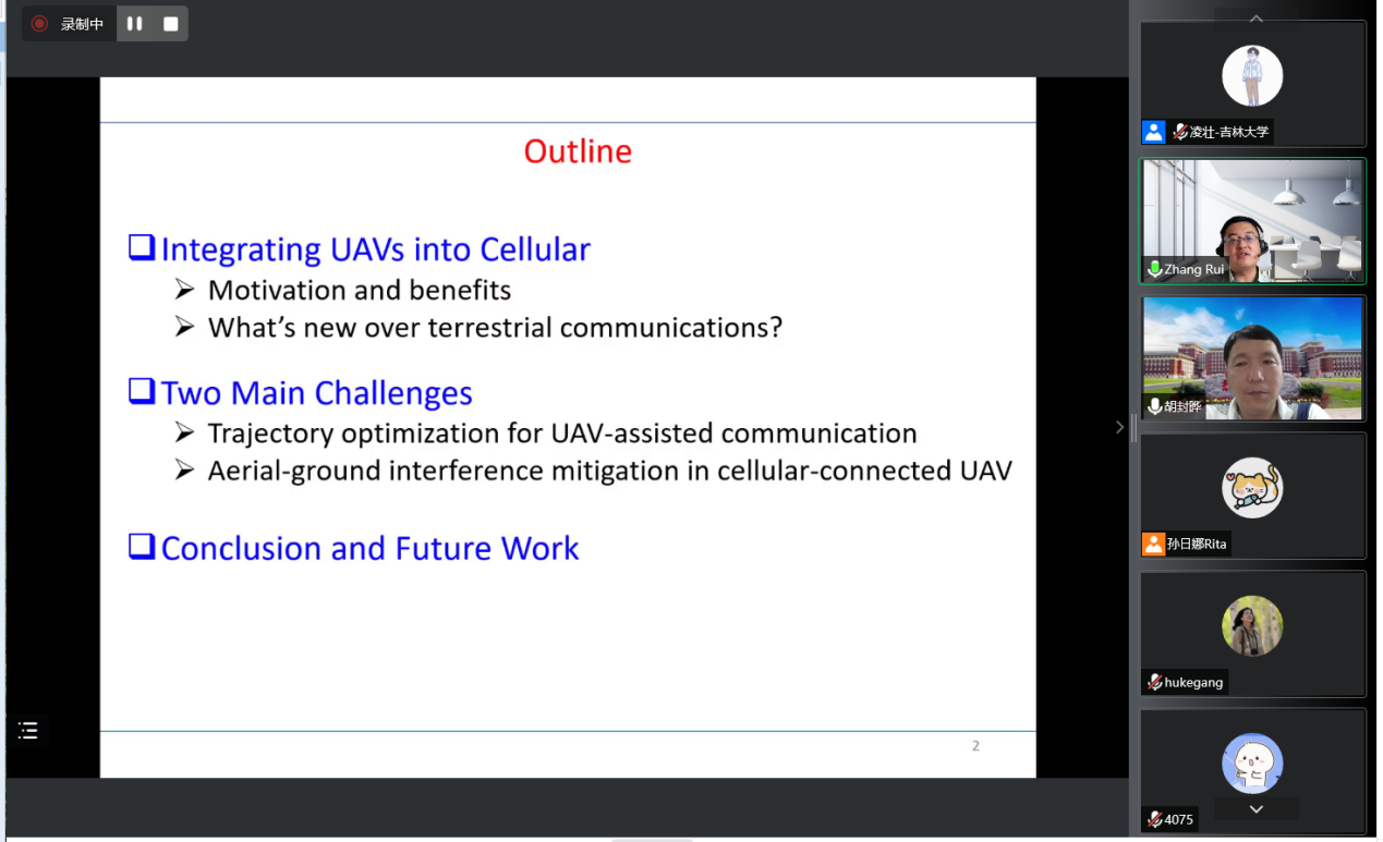 张瑞教授主要介绍了UAV在通信领域的应用及相关问题。针对UAV整合蜂窝网络问题、UAV在通信领域应用中的主要挑战、及未来研究方向三项内容展开,分享了该领域的通用研究框架及标志性成果。首先,张瑞教授讲授了UAV和蜂窝通信结合的几个典型应用,并指出UAV作为终端或者作为基站是UAV接入蜂窝网的两个主要方向。其次,针对UAV通信面临的两个主要挑战,即路径规划和通信的联合设计,以及UAV连接蜂窝网时产生的空对地干扰问题,张教授分享了近期的研究成果和解决方案。最后张瑞教授总结了UAV对未来5G/6G的应用以及未来可以研究的方向。